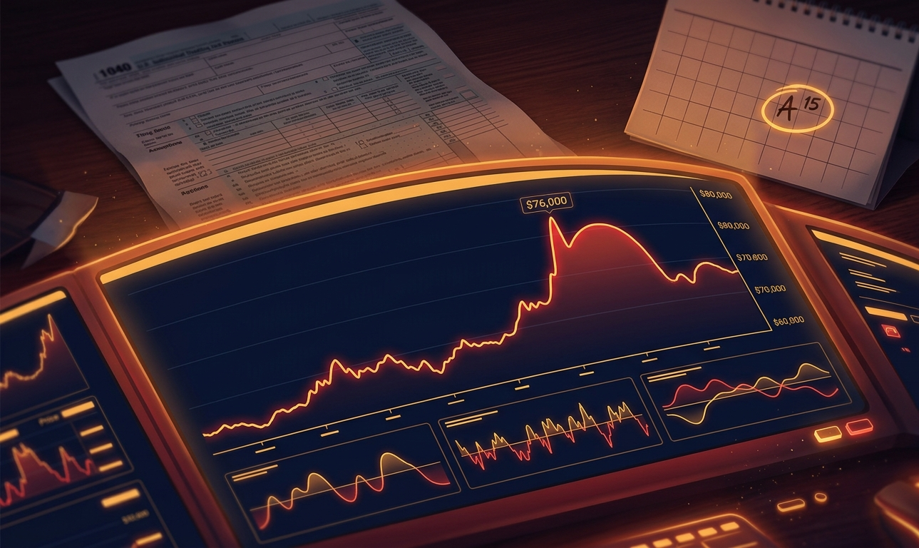 Bitcoin is pulling back on April 15, 2026, the US federal tax filing deadline, after briefly touching $75,700 on Tuesday in what looked like the start of a genuine breakout. Bitcoin briefly topped the key $76,000 level before reversing to $74,000, extending a two-month struggle to sustain a true breakout. Today’s retreat is being driven by a combination of factors: routine profit-taking ahead of the tax deadline, position unwinding rather than fresh shorting, a stall in CLARITY Act momentum, and the mechanical reality that $75,000 has now rejected Bitcoin twice in as many weeks. The market is not collapsing. It is digesting.